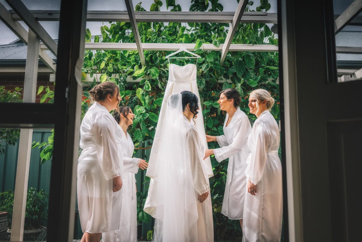 At Bianca’s Parents home. The girls had their make up and hair all prepared on my arrival leaving plenty of time for socializing with family and for some informal fun shots before donning on the wedding dress.